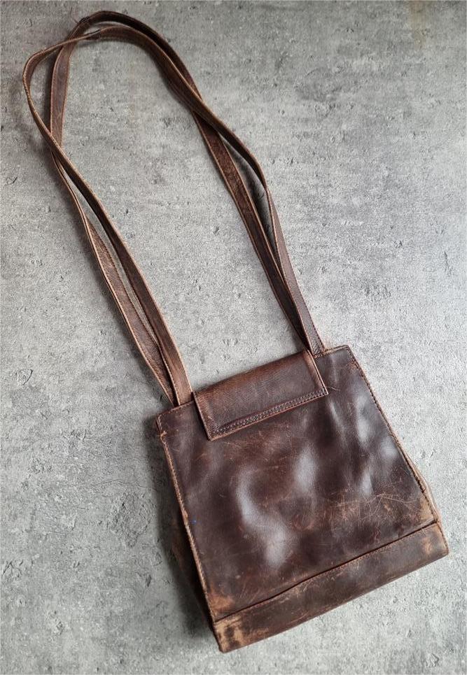 Vintage brązowa torebka z widocznymi zarysowaniami.