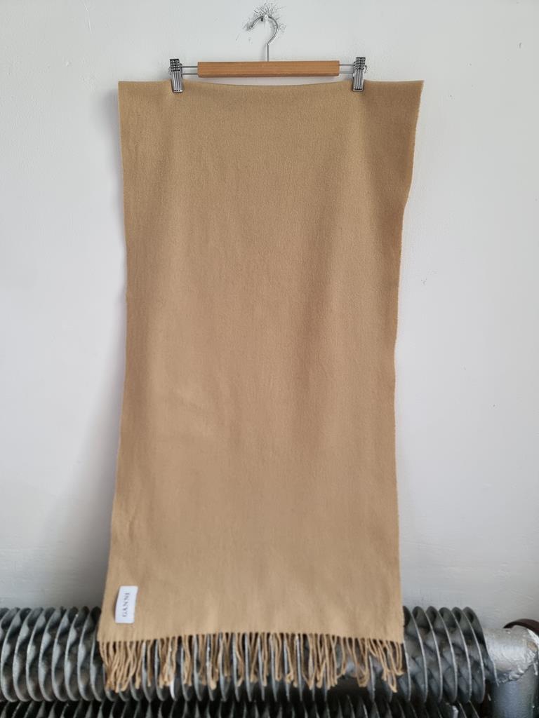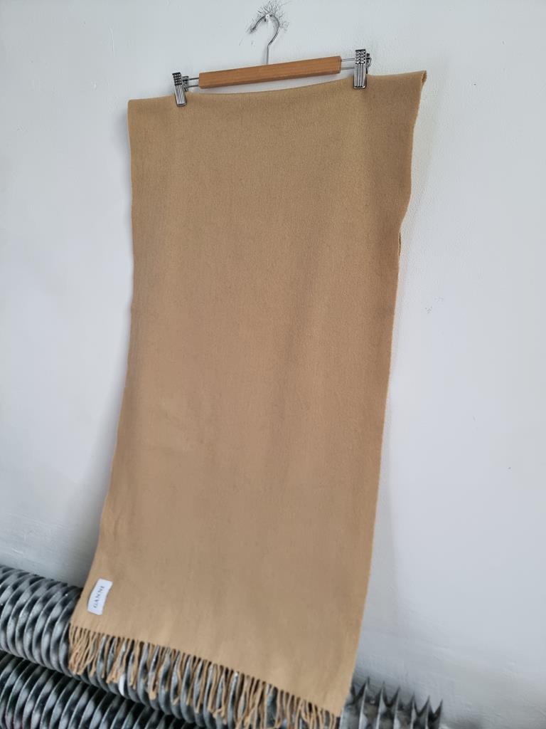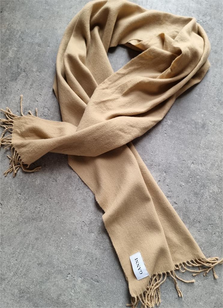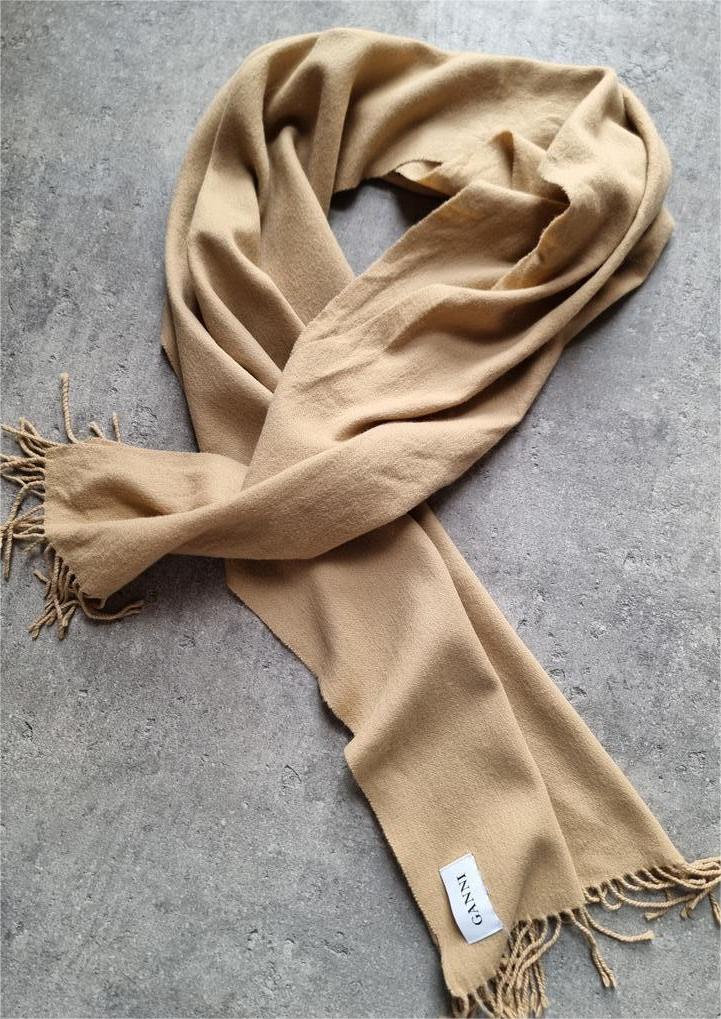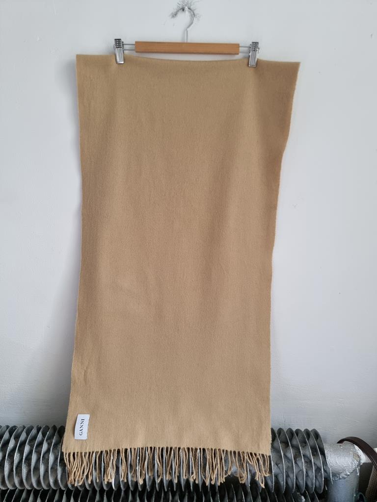 Szeroki długi szal wełniany w kolorze beżowym. Zakończony frędzlami.