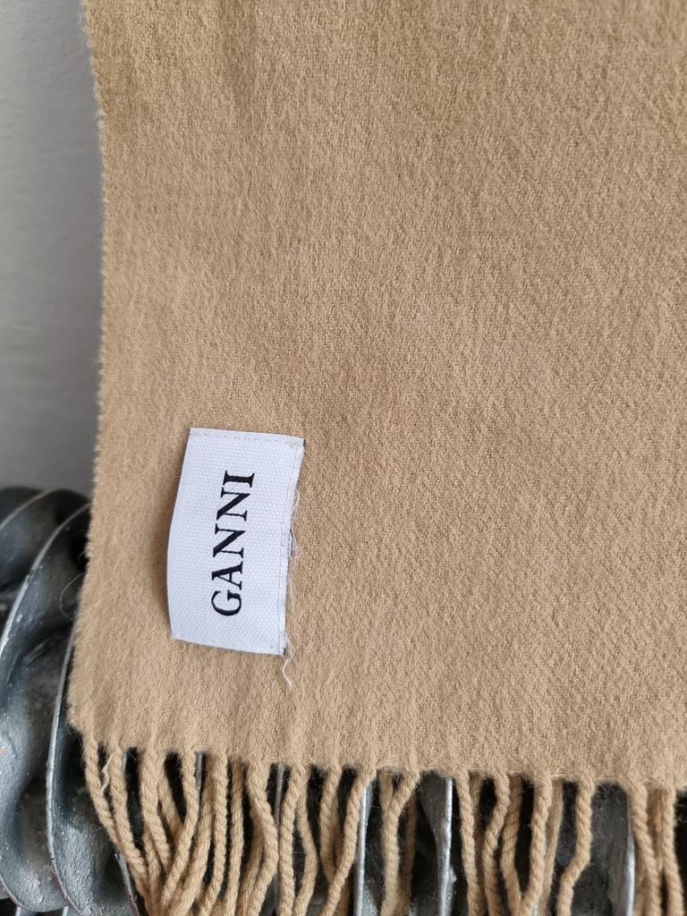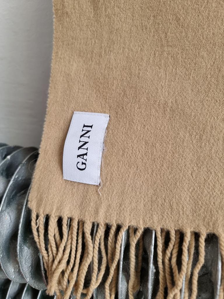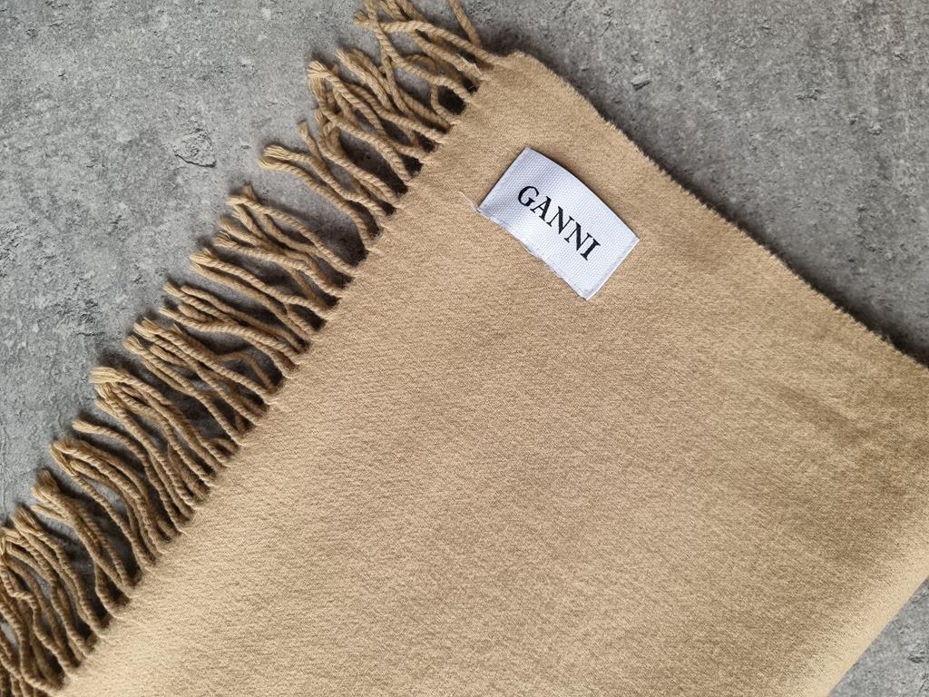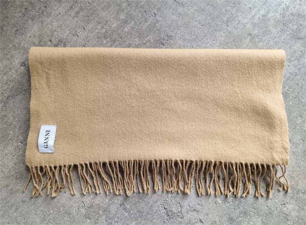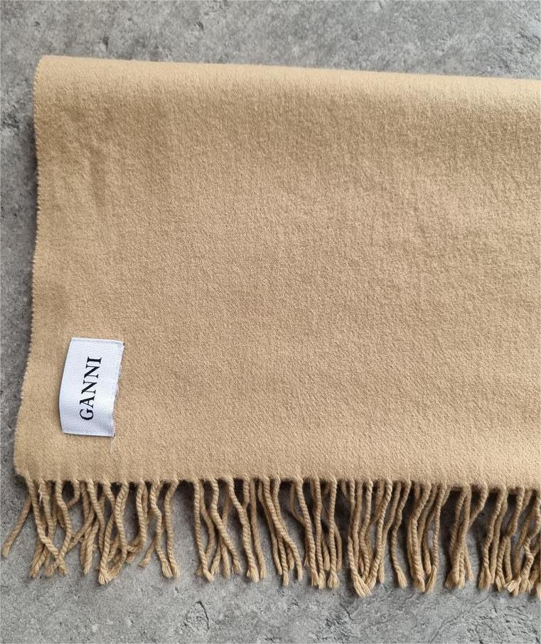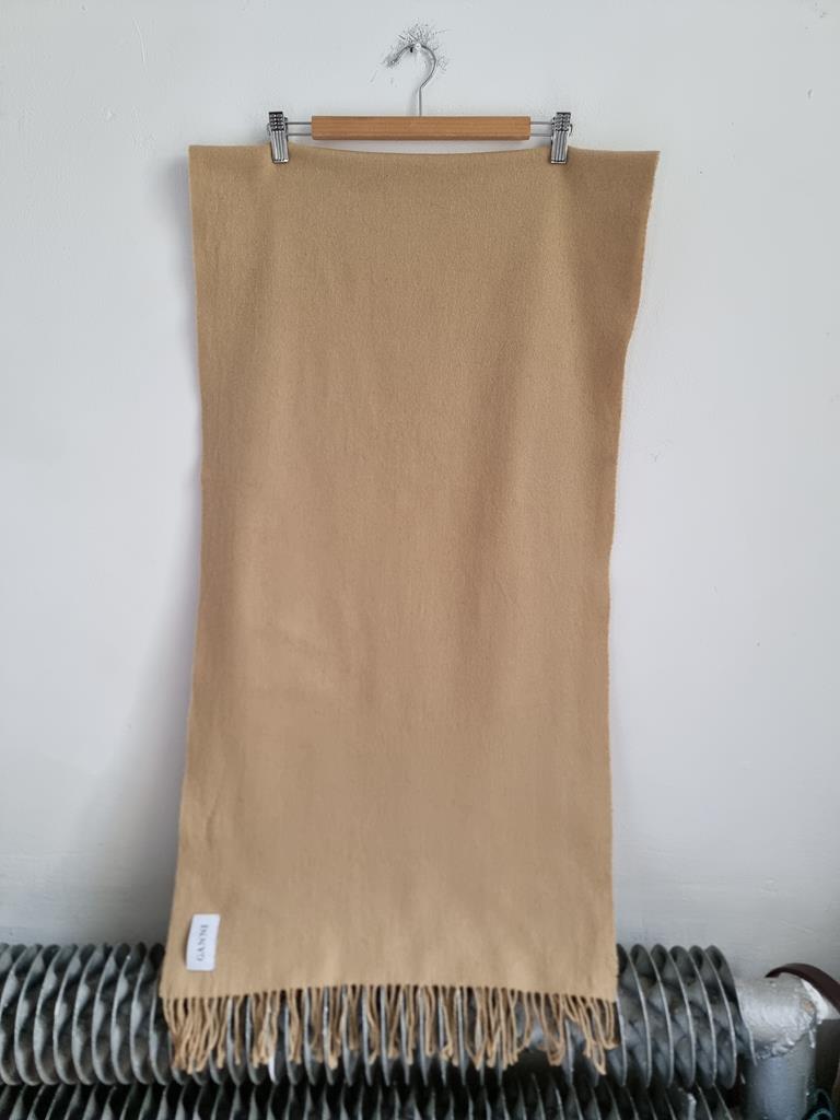 Szeroki długi szal wełniany w kolorze beżowym. Zakończony frędzlami.