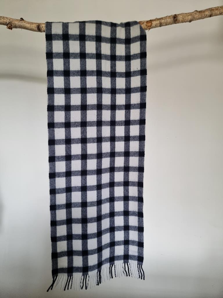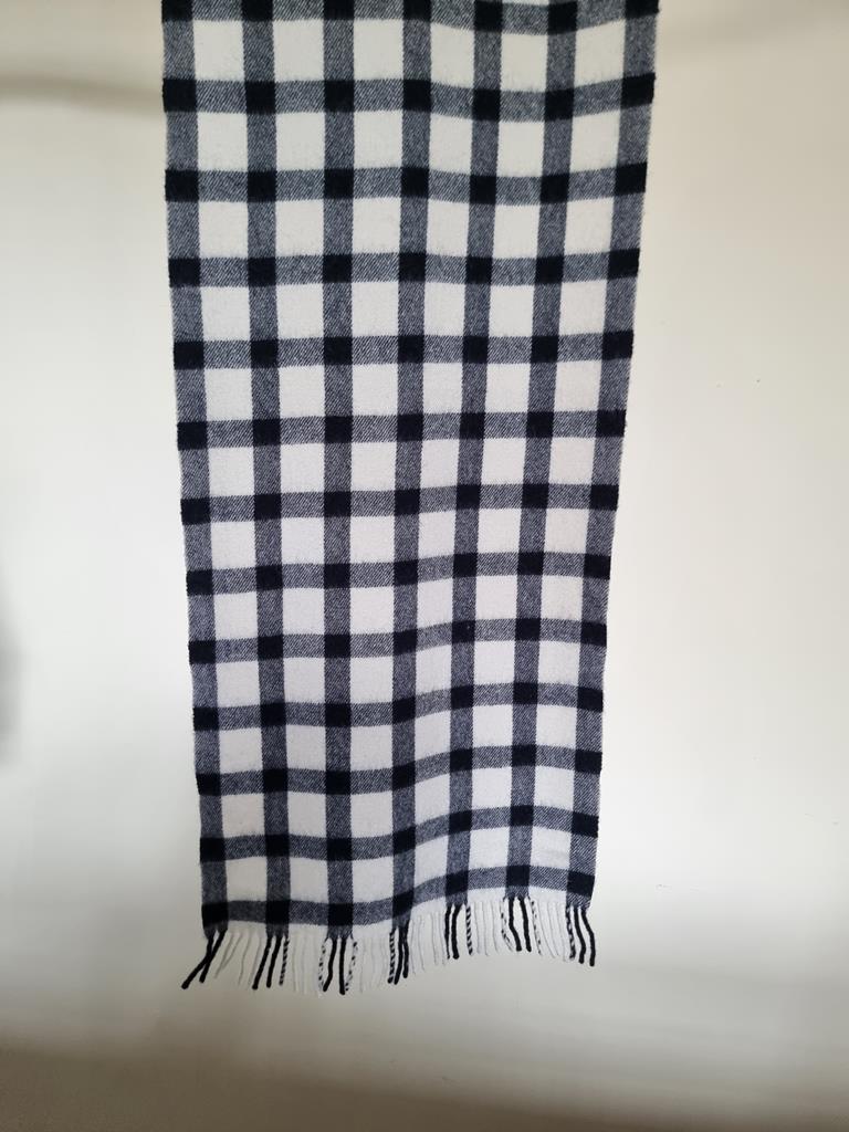 Biało granatowy szal w kratkę. Zakończony frędzlami.