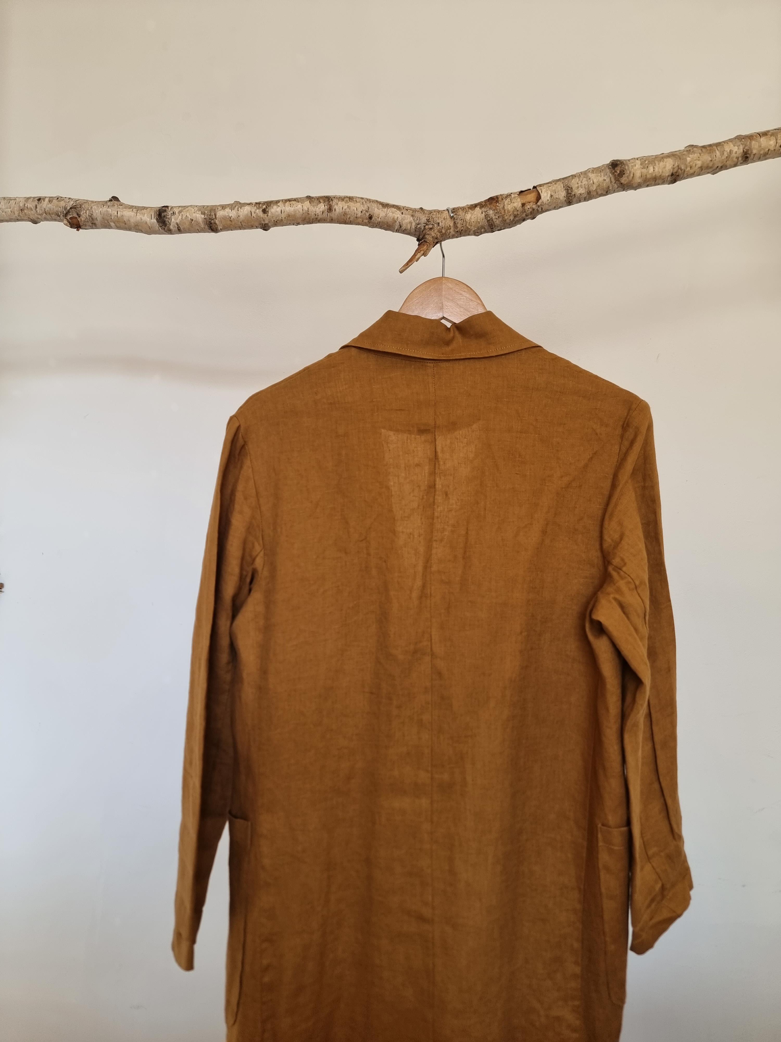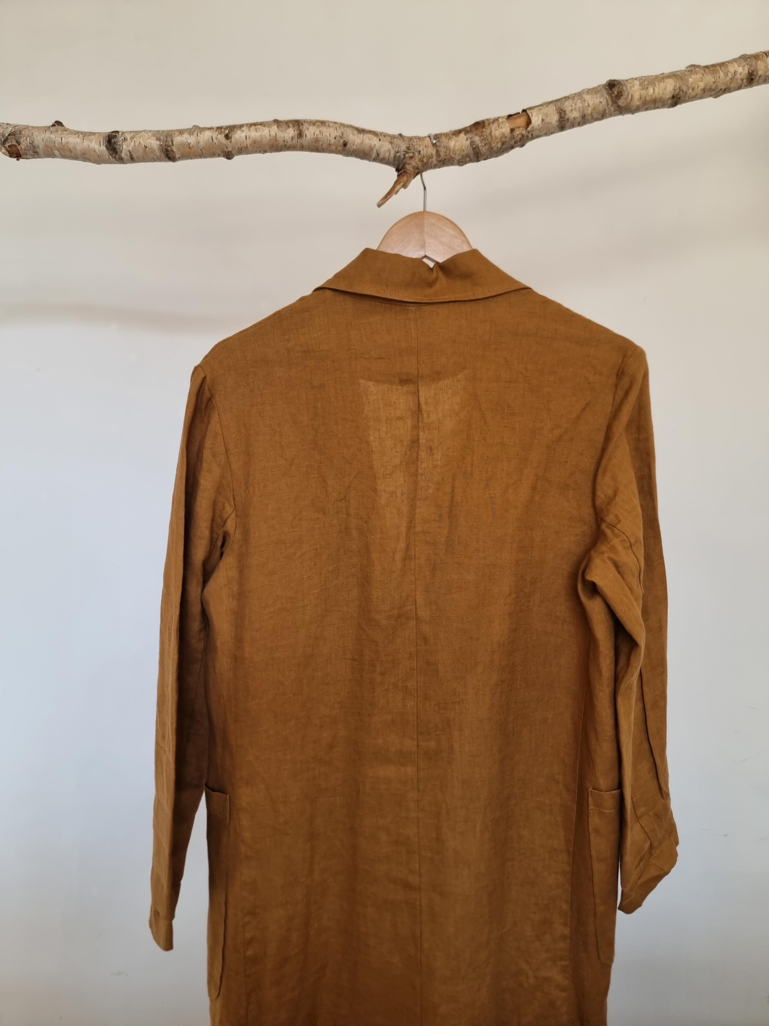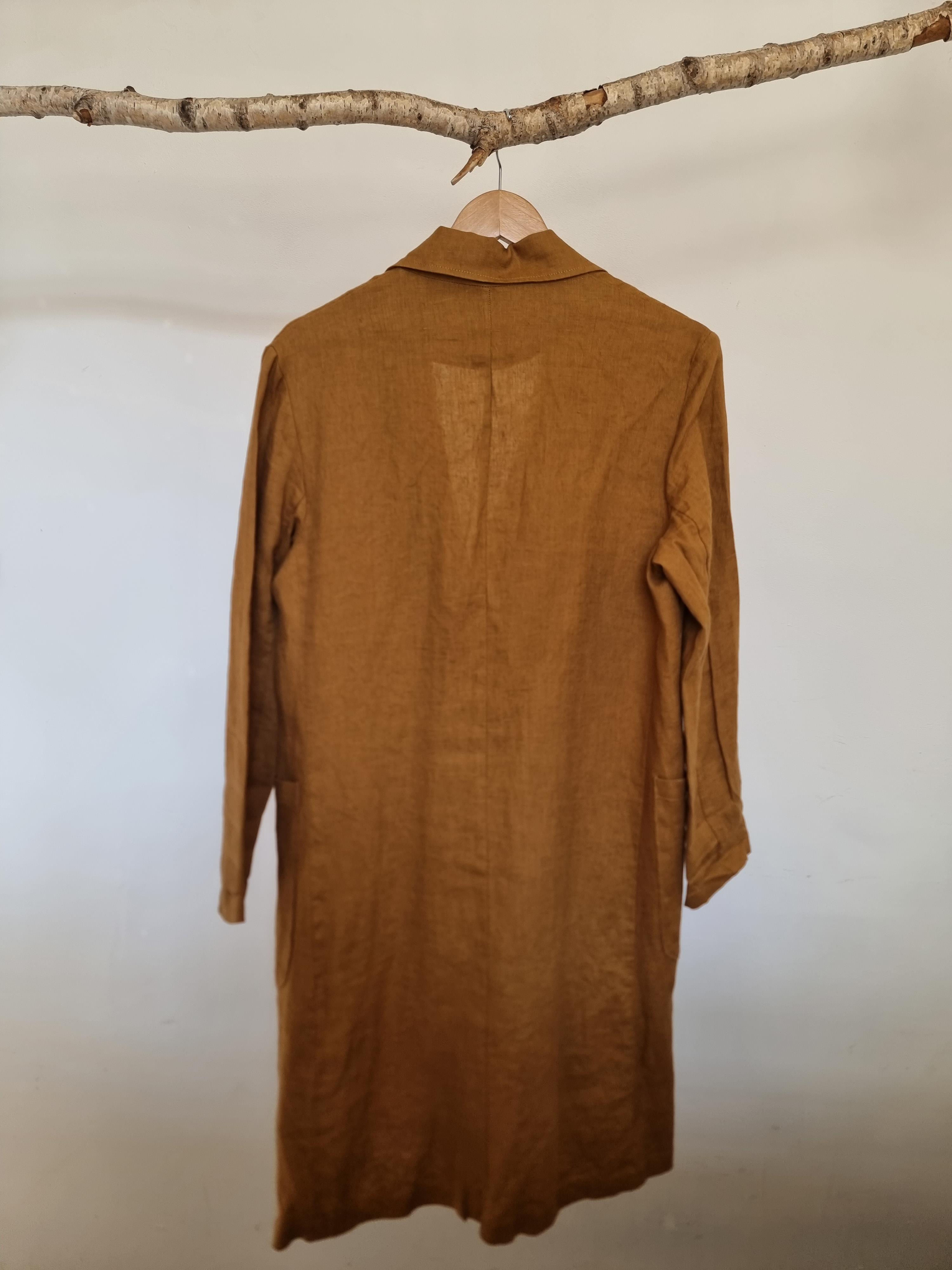Miodowy lniany płaszcz / narzutka. Dwurzędowe guziki. Z przodu dwie duże kieszenie.