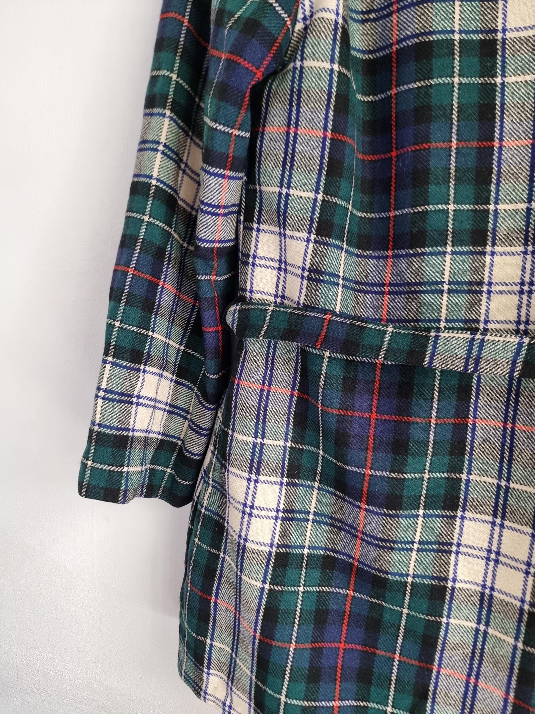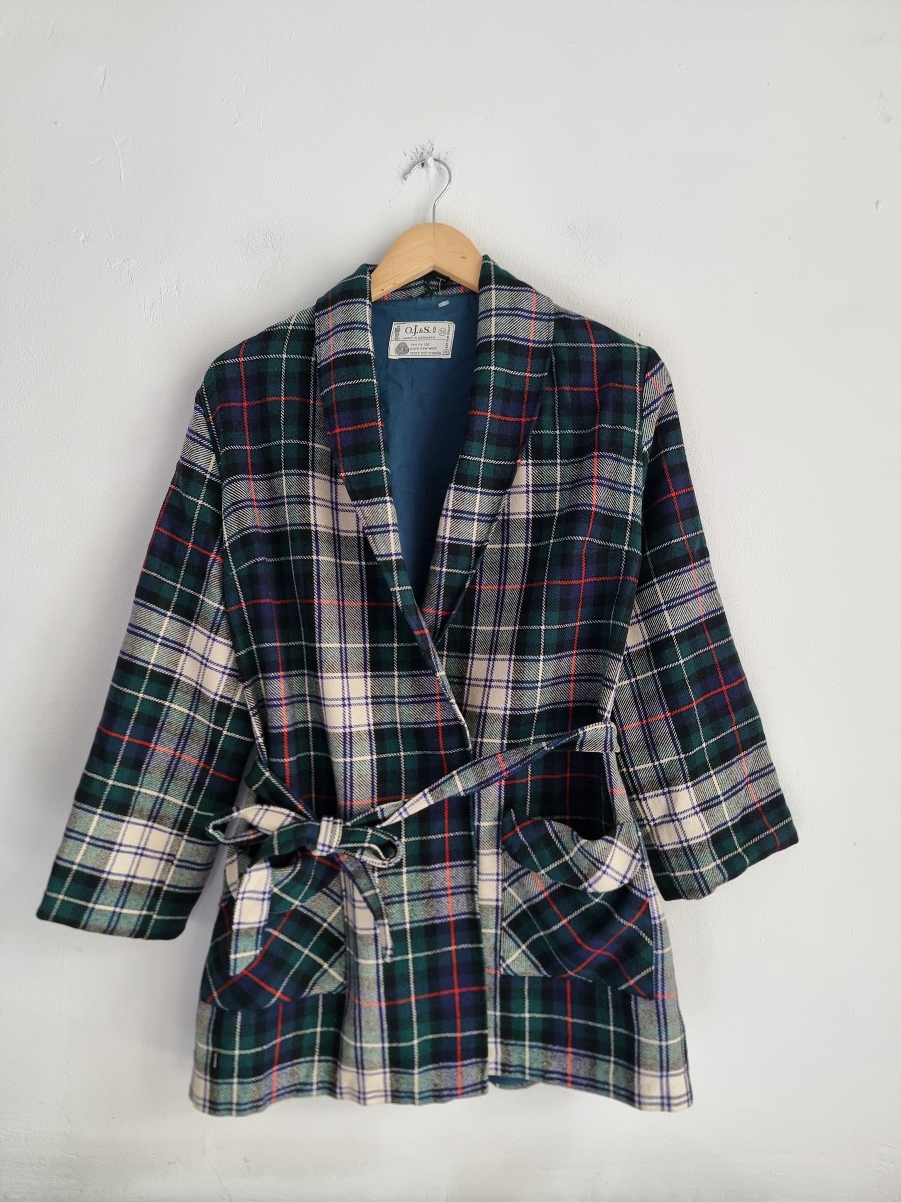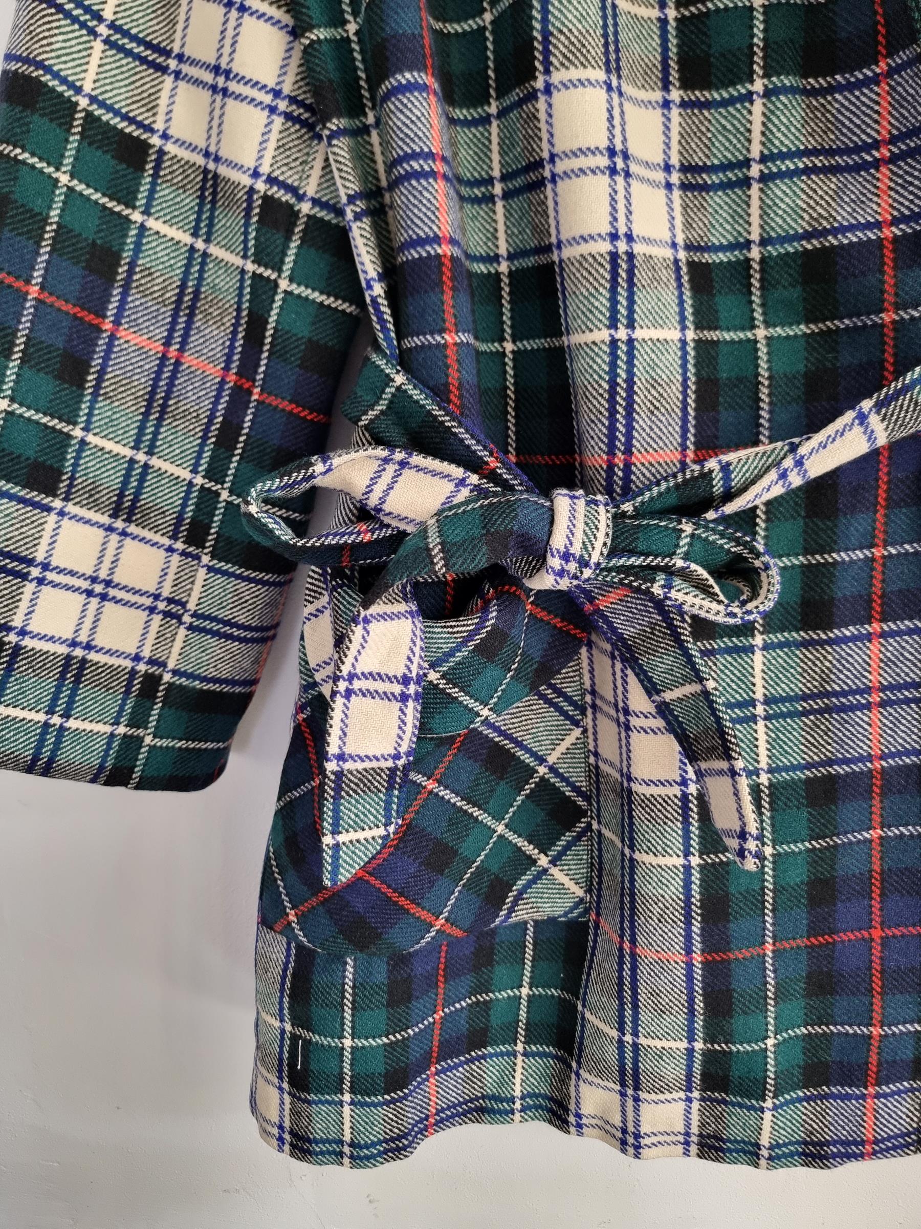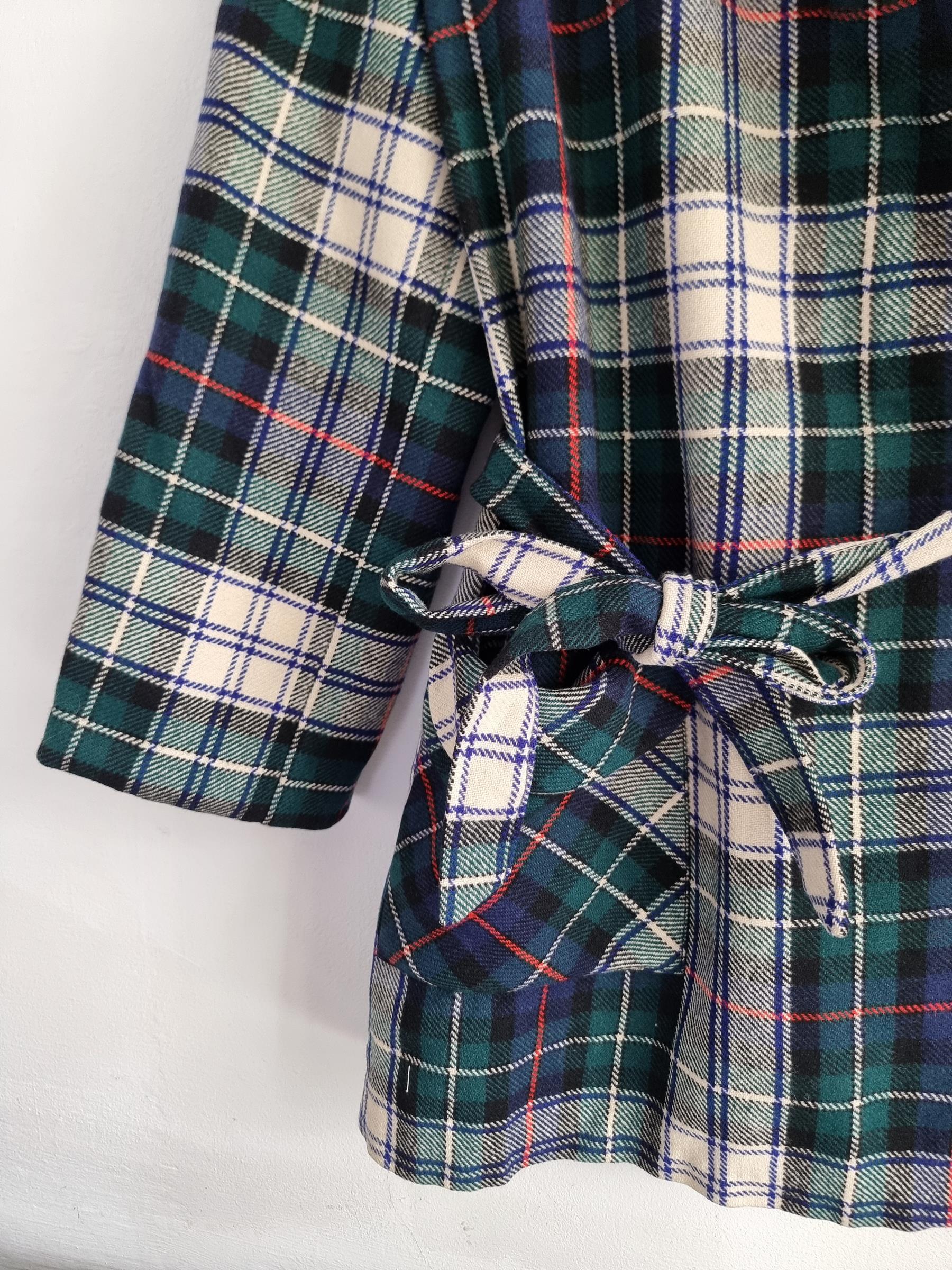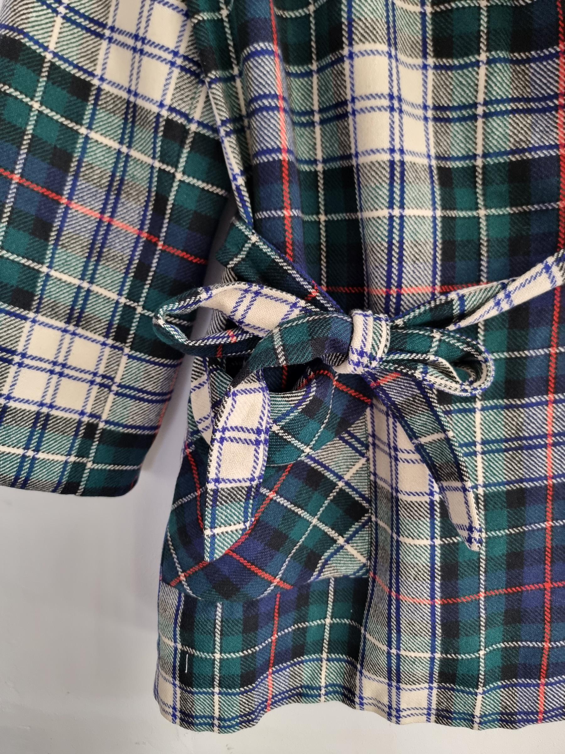 Marynarka wełniana w kratkę z wiązaniem w talii i dwoma dużymi kieszeniami.
