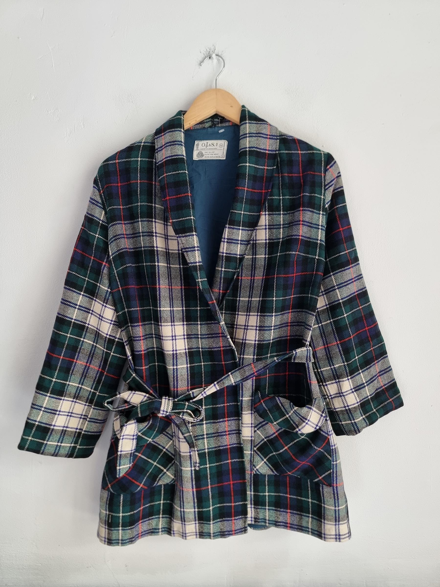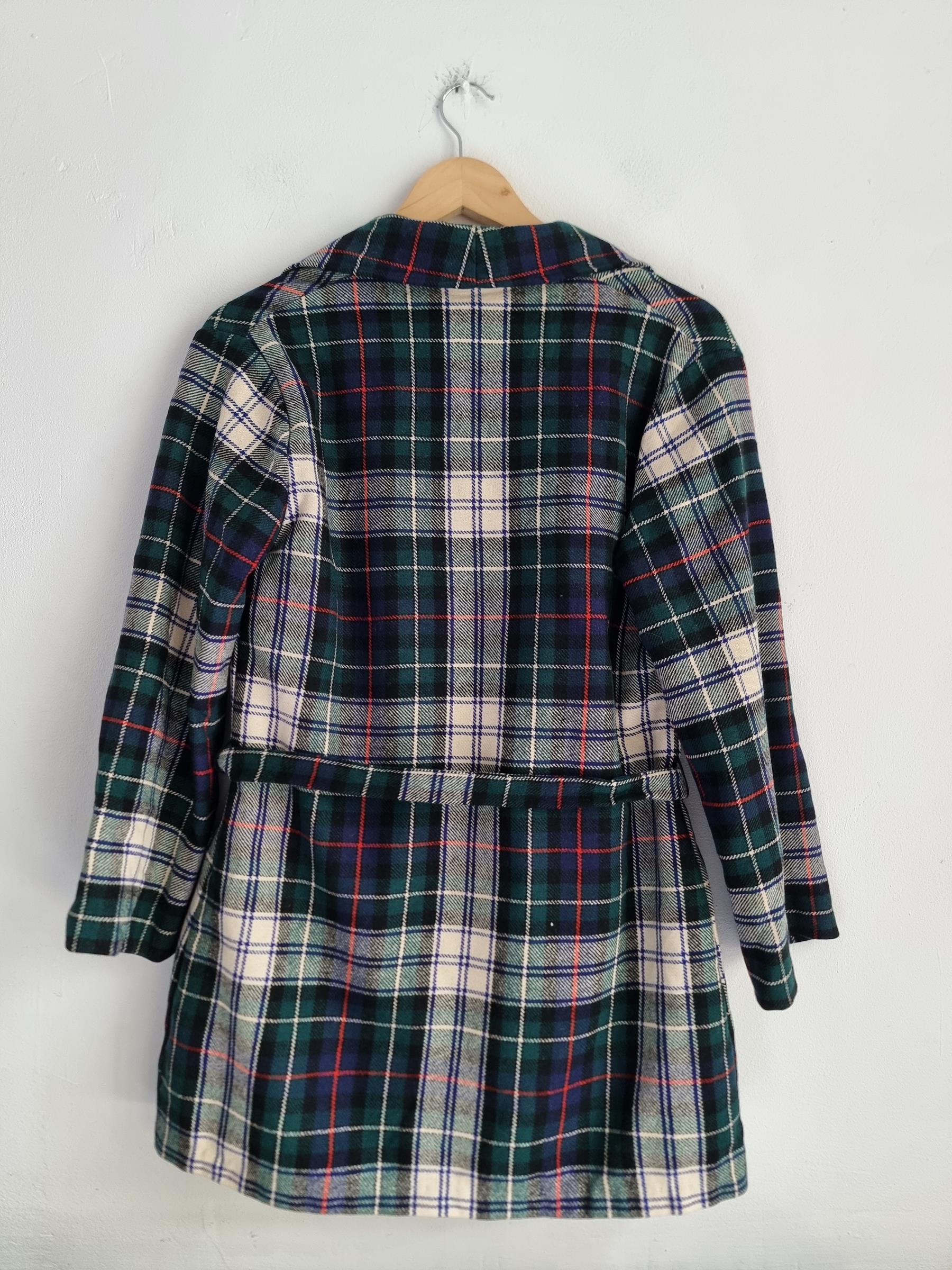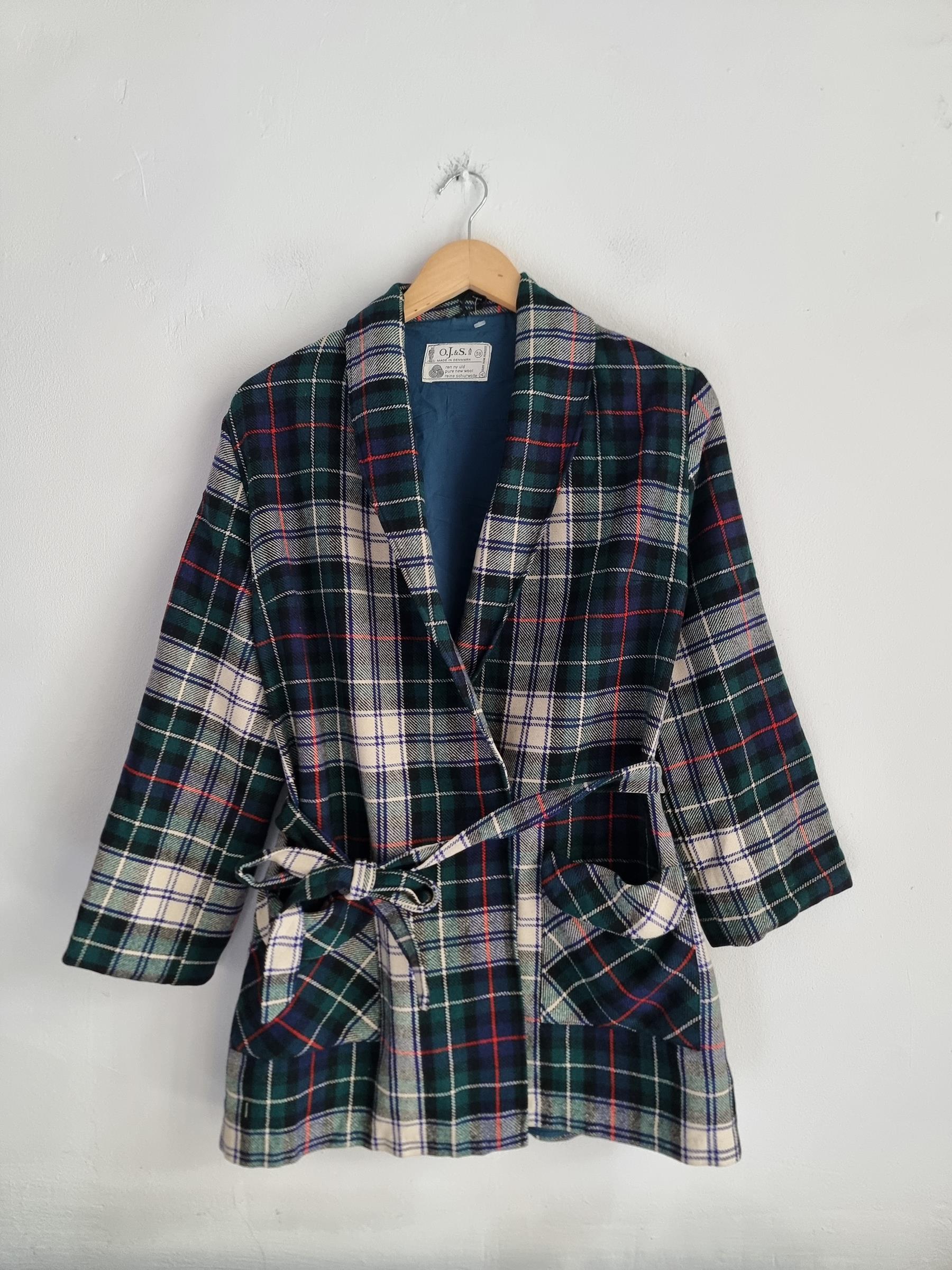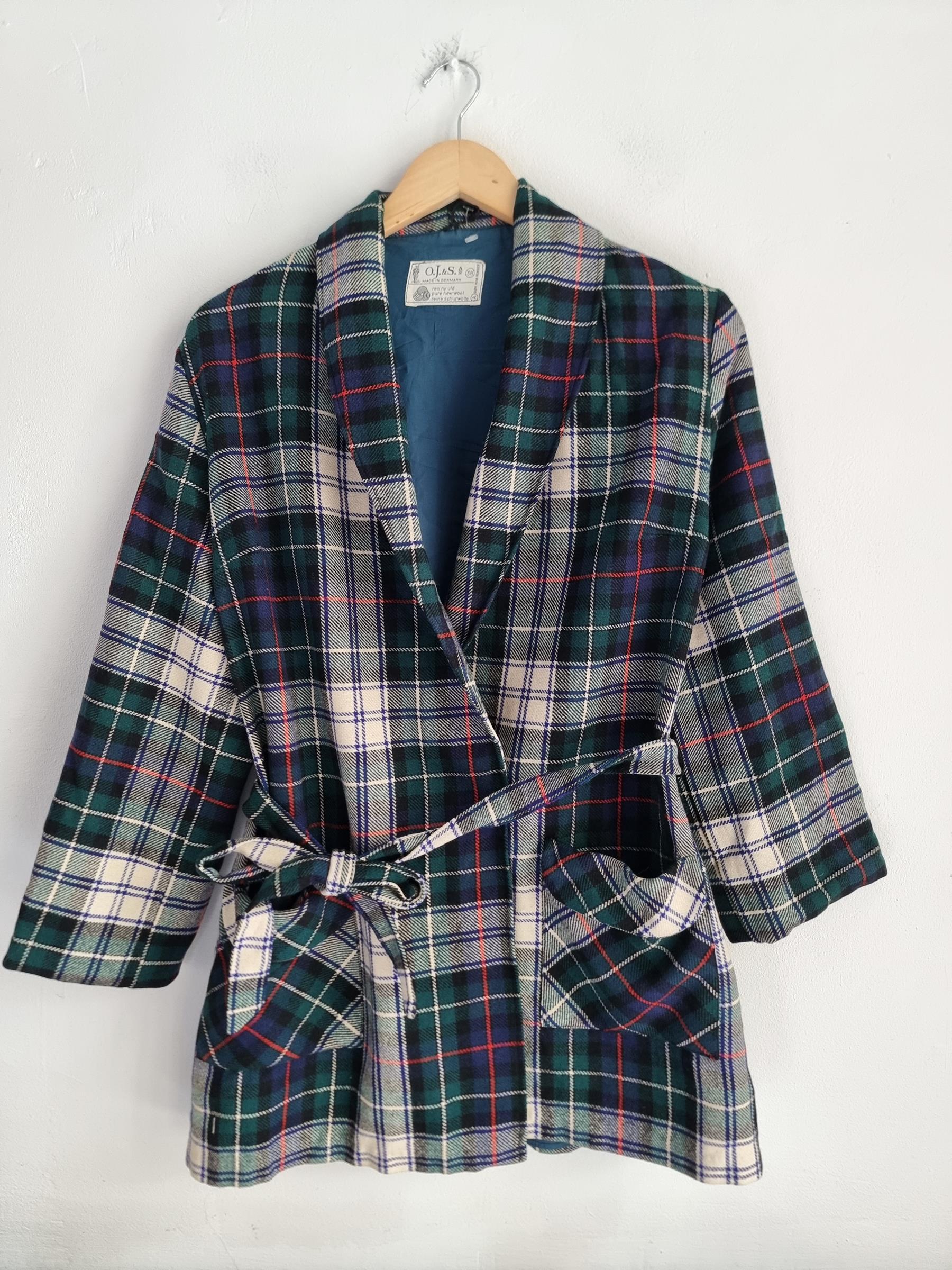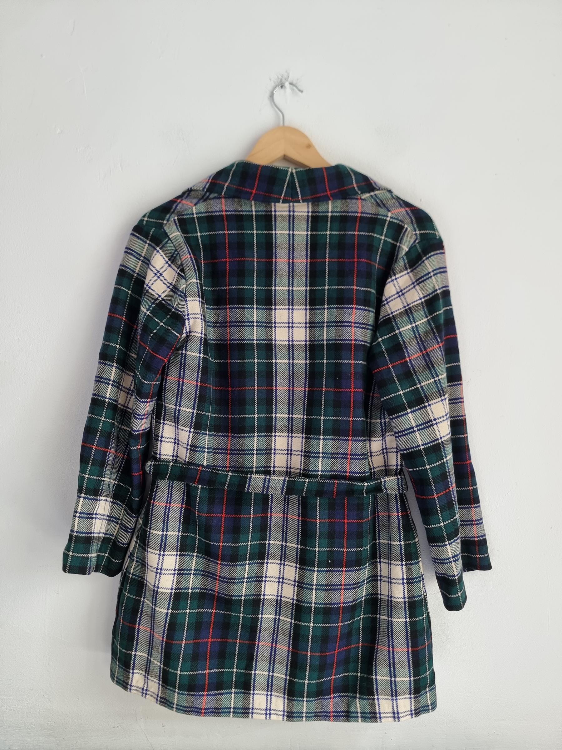 Marynarka wełniana w kratkę z wiązaniem w talii i dwoma dużymi kieszeniami.