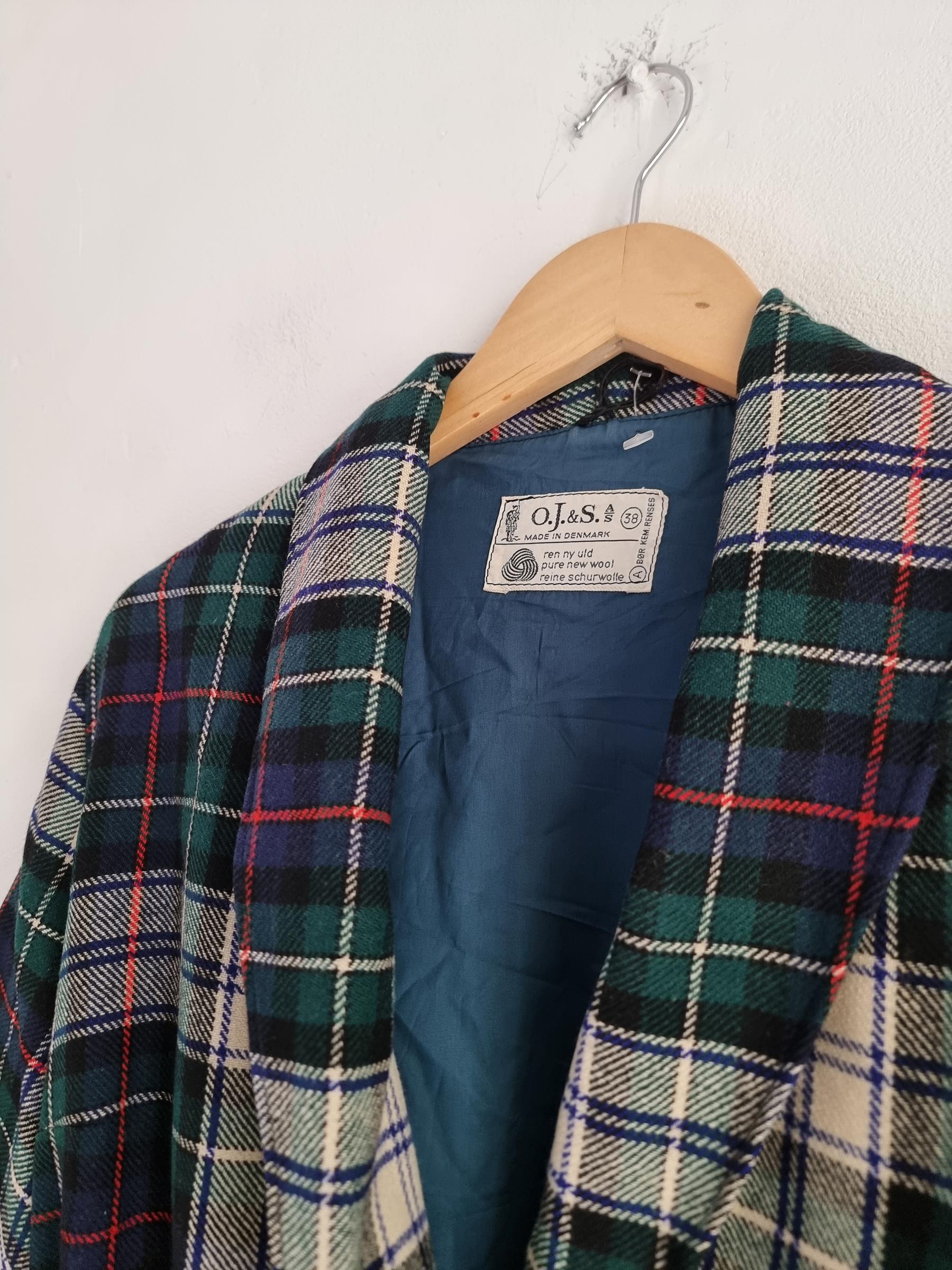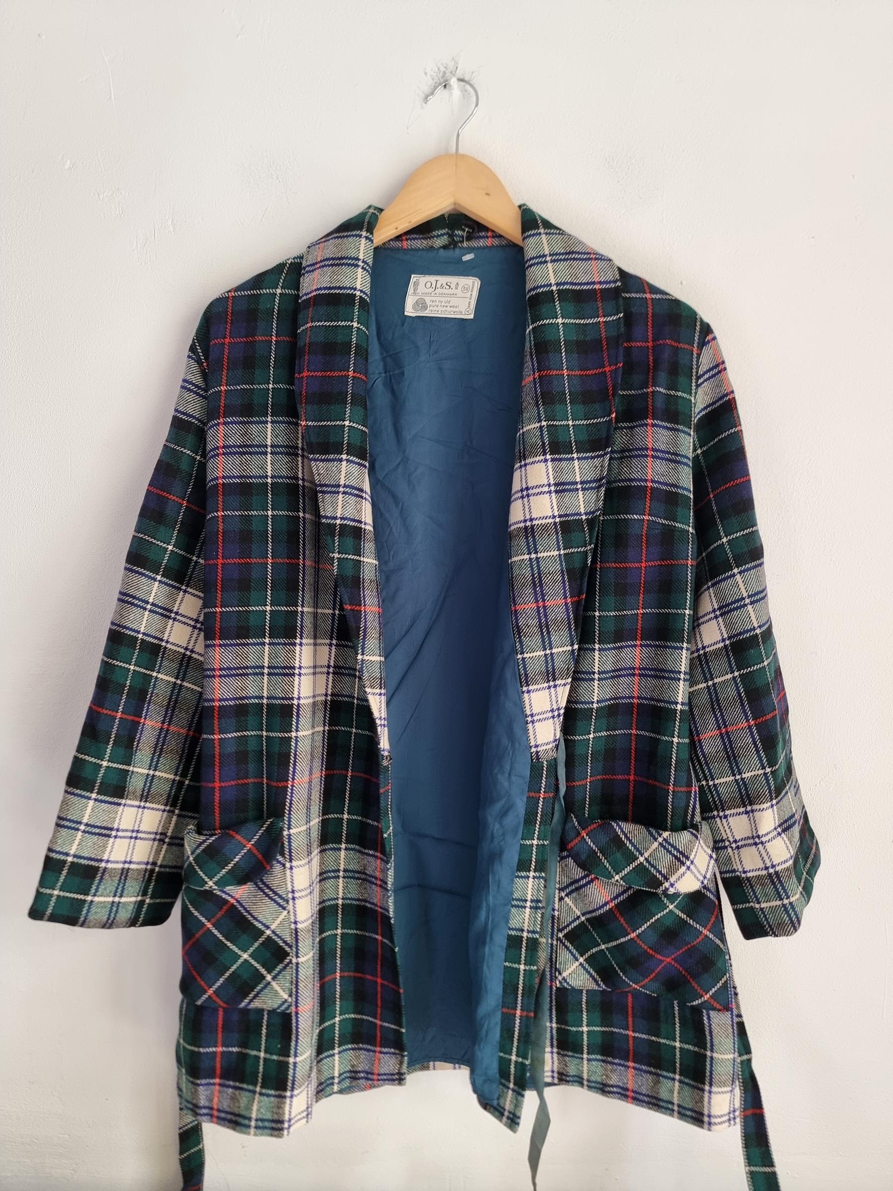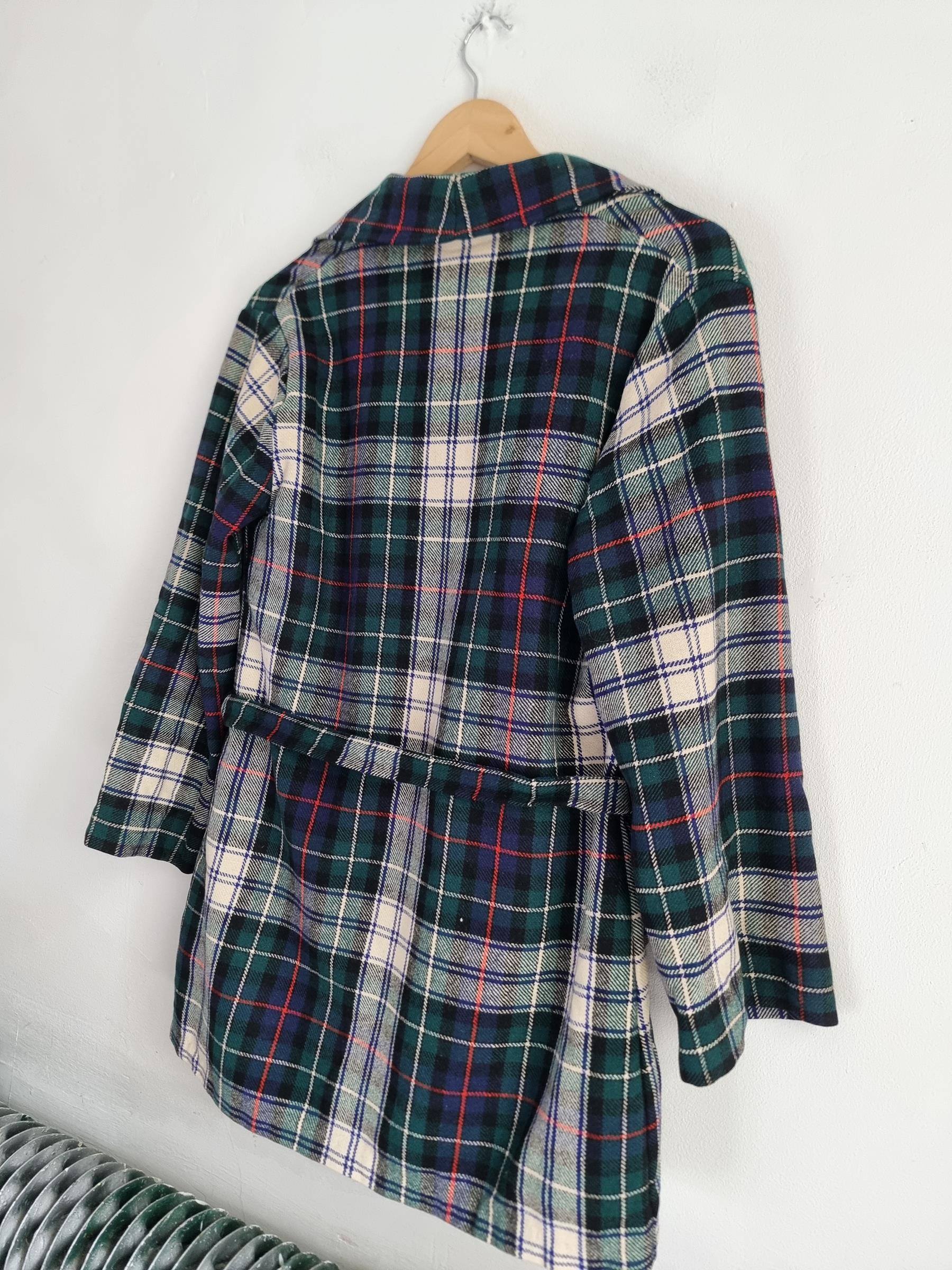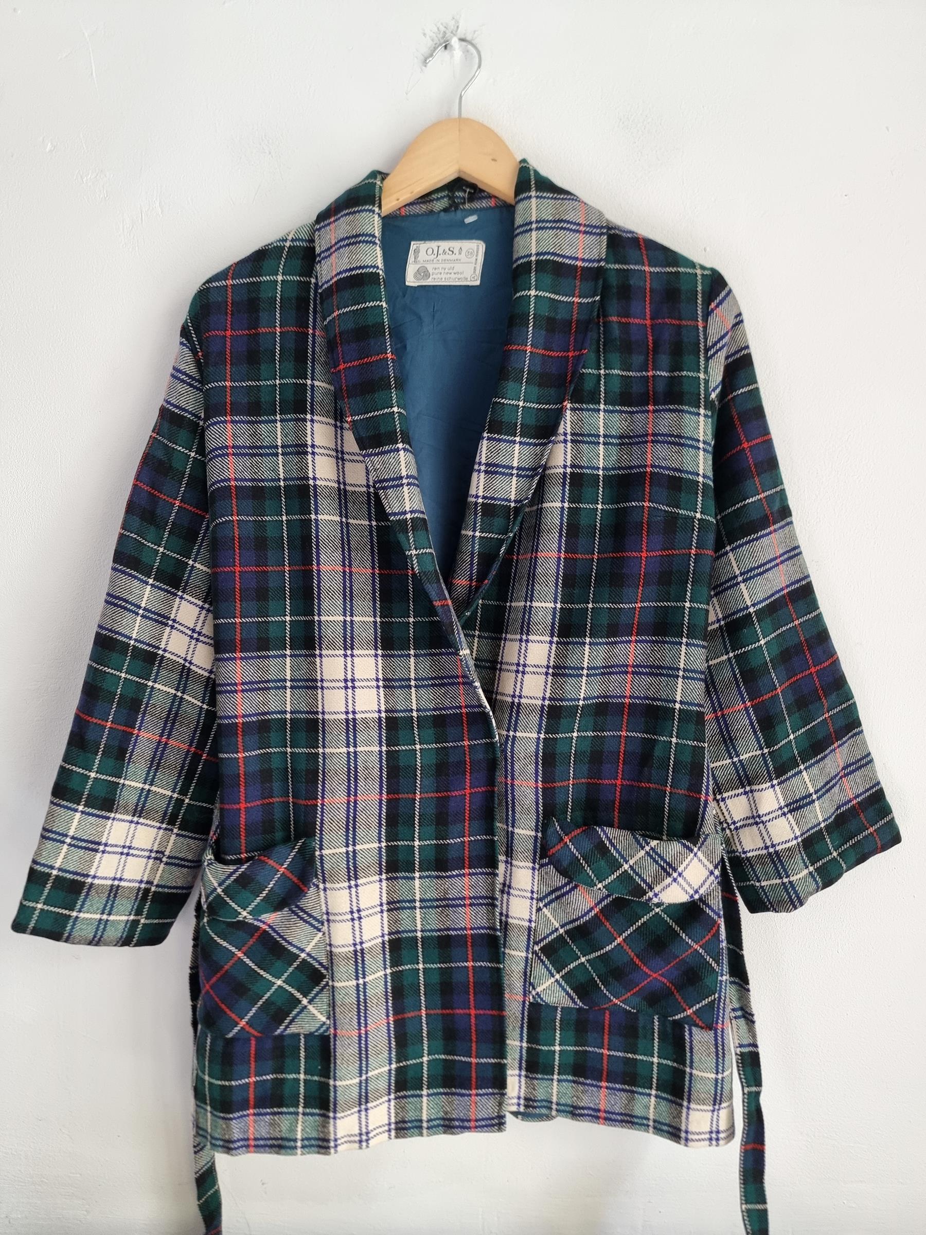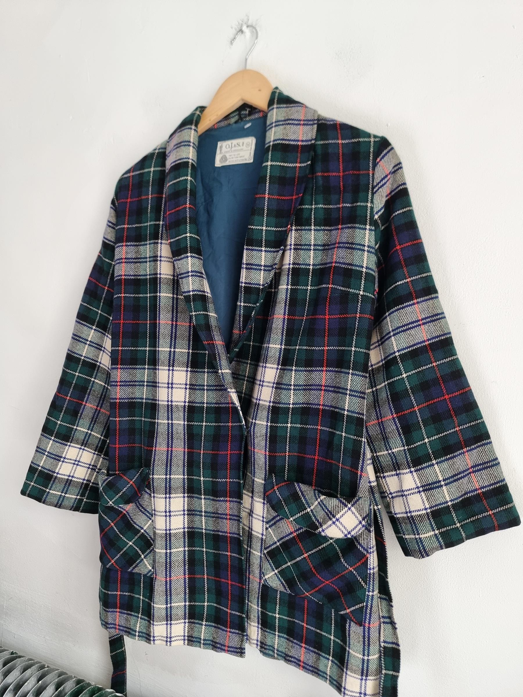 Marynarka wełniana w kratkę z wiązaniem w talii i dwoma dużymi kieszeniami.